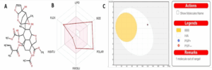 Figure 1: Azadiractin-A (A) Chemical Structure, (B) bioavailability radar and Boiled egg model for blood brain barrier permeation and intestinal absorption property of Azadiractin A.
