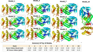 Figure 2: The top ten (10) binding affinities and models of Azadiractin interactions with chymotrypsin-like protease (3CLpro) of covid 19
