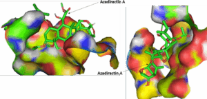 Receptor-ligand interactions play useful roles in structure-based drug discovery and development. We analyzed protein-ligand binding complex interactions of Azadiractin A with 3CLpro-SARS- CoV-2 using molecular docking studies. Interestingly, we found that Azadiractin A interacted with 3CLpro-SARS-CoV-2 with binding affinities ranges between -6.3 and -5.20 kcal/mol, and Pkd of 5.82~6.10 for the ten best binding mode (Figure 2).