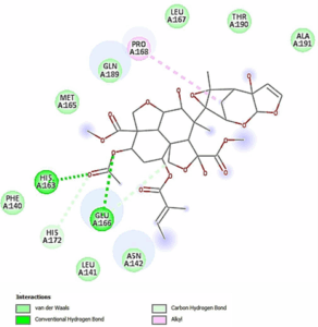 The unique stability of Azadiractin A in the binding site of the 3CLpro-SARS-CoV-2 could be attributed to the H-bond and. The high affinity of Azadiractin A was also associated with the presence of larger number of Van der waal forces created on it backbone the respective amino acids ASN142, LEU141, PHE140, MET165, GLN189, LEU167,