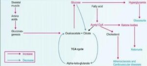 As hyperglycaemia prolongs, the body cells are devoid of glucose due to the lack of insulin. This forces the cells to seek alternative mobilisable energy sources. In this regard, the cells turn to fatty acids stored in adipose tissue. The fats are not fuel sources for the red blood cells, kidney cortex and the brain. The red blood cells lack mitochondria in which beta-oxidation pathway occurs. The fatty acids cannot pass the blood-brain barrier. To avail energy to such cells and tissues, the acetyl-CoA arising from catabolism of fatty acids is diverted to ketogenesis to generate ketone bodies, which can serve as alternative fuel sources for such cells and tissues. These ketone bodies are also passed in the urine, thereby leading to ketonuria, which characterises diabetes mellitus. Buildup of ketone bodies in the blood produces ketosis. Ketone bodies are acidic in nature and therefore, their build up in blood lowers blood pH, leading to acidosis. A combination of ketosis and acidosis lead to a condition called ketoacidosis. If left untreated, ketoacidosis leads to coma and death (Belinda, 2004).