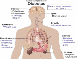 Diabetes symptoms vary depending on blood sugar level of individual with diabetes. Type 2 diabetes, in particular, develops slowly. Many people have type 2 diabetes for as long as eight years before it is diagnosed. When symptoms do develop, they often vary. But two symptoms that occur in many people with the disease are increased thirst (polydipsia) and frequent urination (polyuria) due to excess glucose circulating in the body draws water from the tissues, making diabetics feel dehydrated. To quench the thirst, they drink a lot of water and other beverages, and that leads to more frequent urination (Davidson et al., 2003). Other warning symptoms of diabetes mellitus are fatigue, irritability, blurred vision, slow-healing sores, frequent infections (such as gums or skin infections and vaginal infections), presence of ketones in the urine (ketones are byproduct lipid catabolism), nerve damage, etc. (Taiwo, 2010).